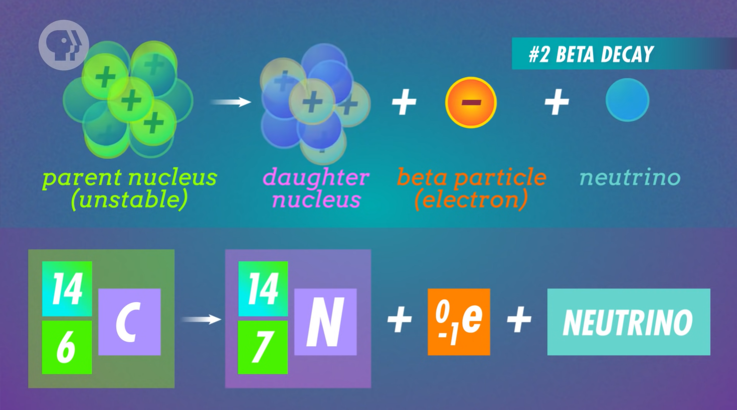 This type of decay usually happens when a nucleus has too many protons or neutrons. Here the atom will shed either a negative or positively charged beta particle (an electron) and a negatively or positively charged neutrino (a neutrally charged particle). Although an electron and antineutrino combo is far more common.