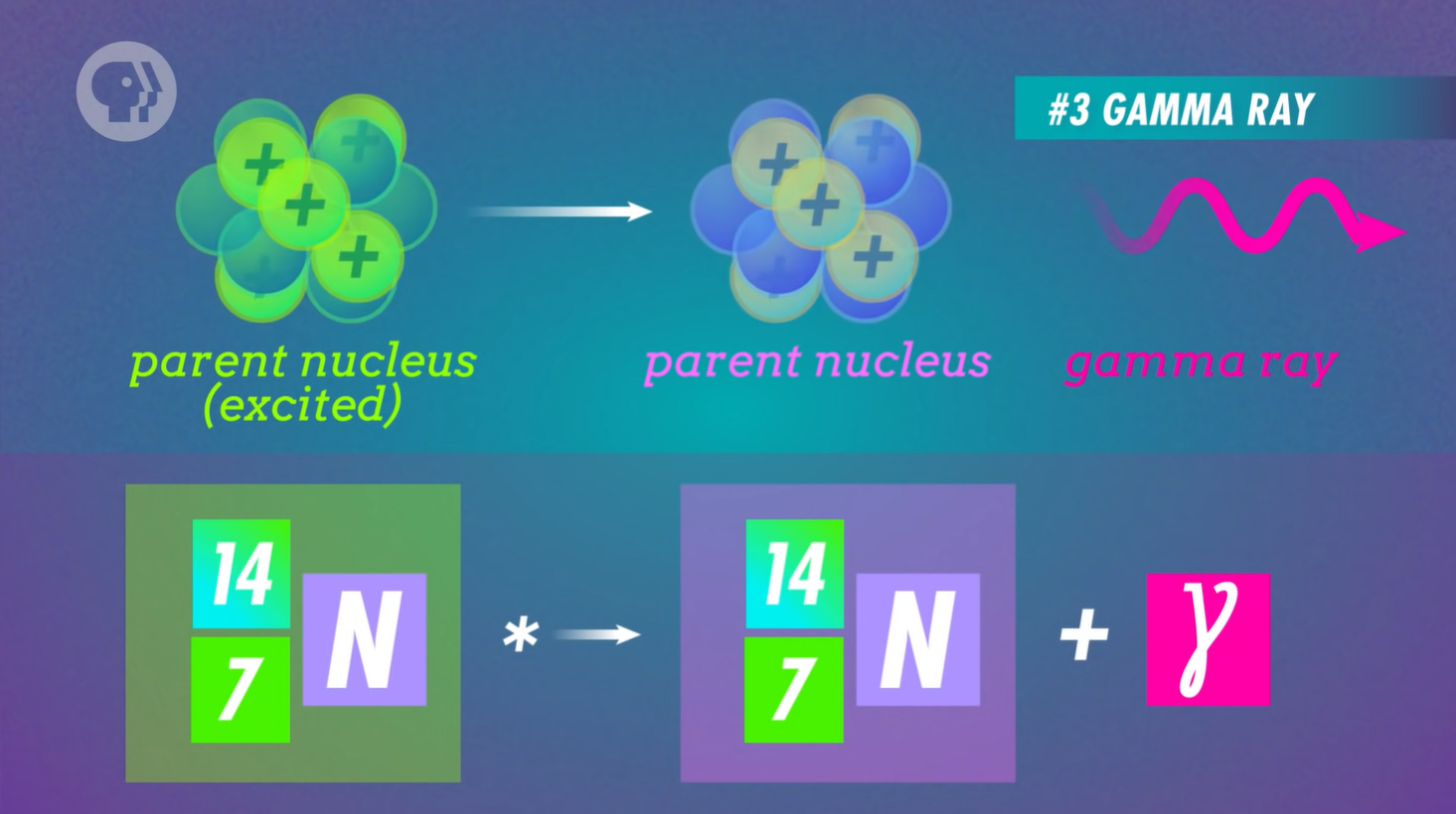 Gamma Decay happens when a nucleus emits high-powered photons, in what is known as gamma rays. This is different from other types of decay as it's actually a (very energetic) wave and not a particle.